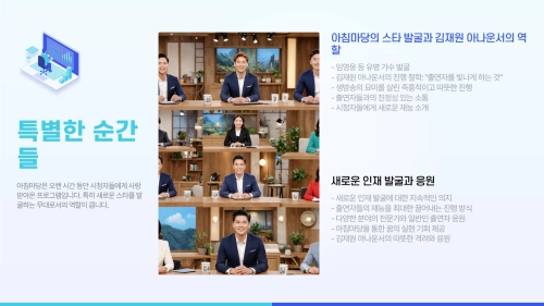 아침마당의 명장면 중 하나는 임영웅 등 스타를 발굴한 무대입니다. 김재원 아나운서는 “출연자들이 빛날 수 있도록 돕는 것이 가장 큰 보람”이라며, 앞으로도 새로운 인재를 응원하겠다는 뜻을 밝혔습니다.