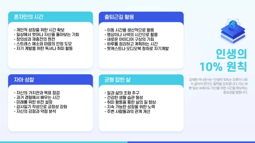 방송인으로 바쁜 삶 속에서도 “인생의 10%는 오롯이 나로서 살아야 한다”는 자신만의 균형 철학을 강조합니다. 출퇴근길, 오래된 애도처럼 혼자만의 시간을 소중히 하며, 그 시간을 통해 자신을 돌아본다고 합니다.