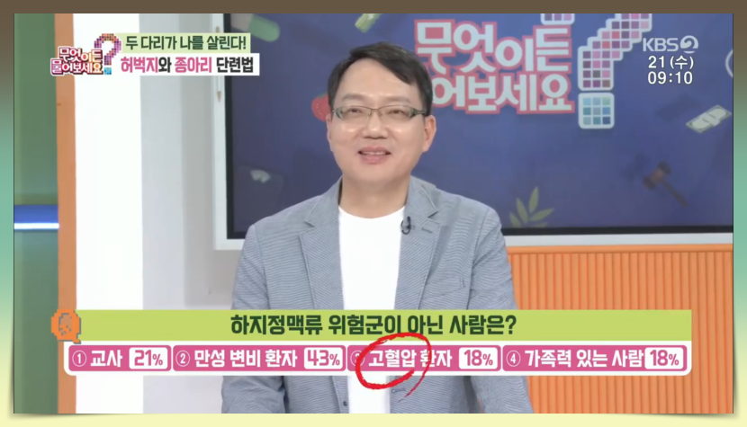 마지막 세 번째 퀴즈 문제는 '하지정맥류 위험군이 아닌 사람은?'이라는 문제였고 정답은 보기 3번 '고혈압환자'라고 합니다.