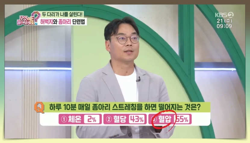 2번 퀴즈는 '하루 10분 매일 종아리 스트레칭을 하면 떨어지는 것은?'이라는 문제였고 체온, 혈당이 아니라 정답은 보기 3번의 '혈압'이었습니다.