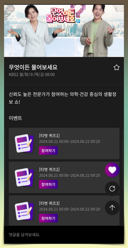 휴대폰에 설치한 티벗 앱으로 무엇이든 물어보세요에 댓글을 보낼 수 있고 퀴즈 참여하기도 할 수 있습니다. 실시간으로 시청자의 댓글이 바로바로 소개된다니 무물보 많이 발전했네요.