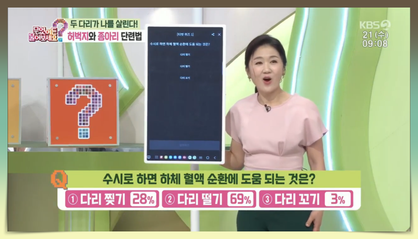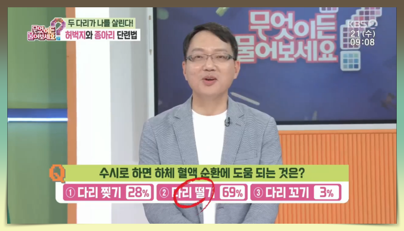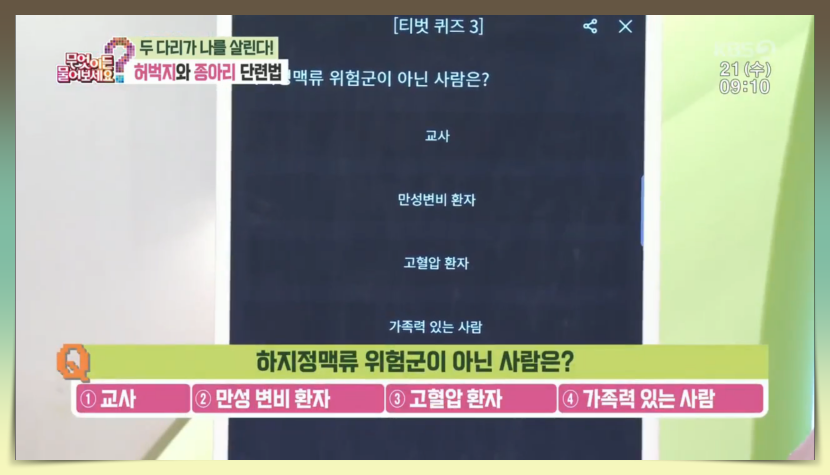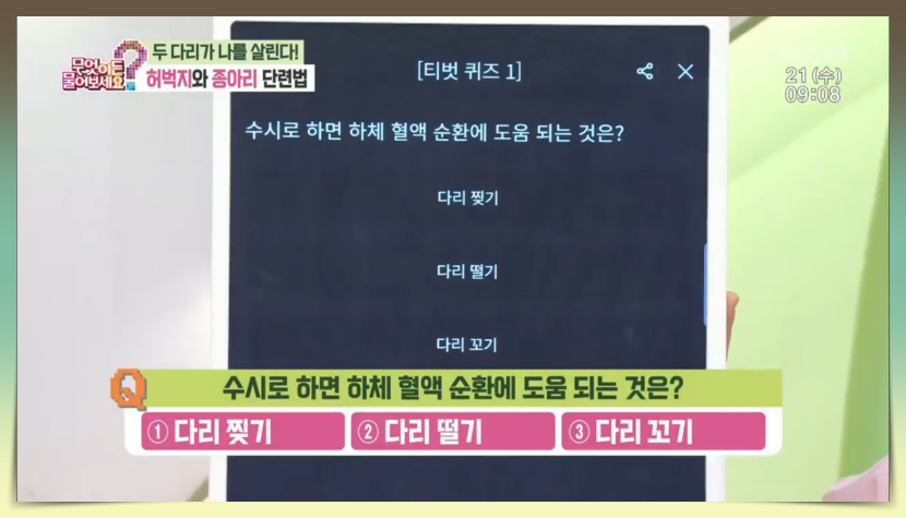 첫 번째 퀴즈 문제는 '수시로 하면 하체 혈액 순환에 도움이 되는 것은?이라는 문제로 보기로는 1번 다리 찢기, 2번 다리 떨기, 3번 다리 꼬기가 주어졌습니다. 이날 나오신 전문가 분께서 정답을 말씀해 주셨는데요.