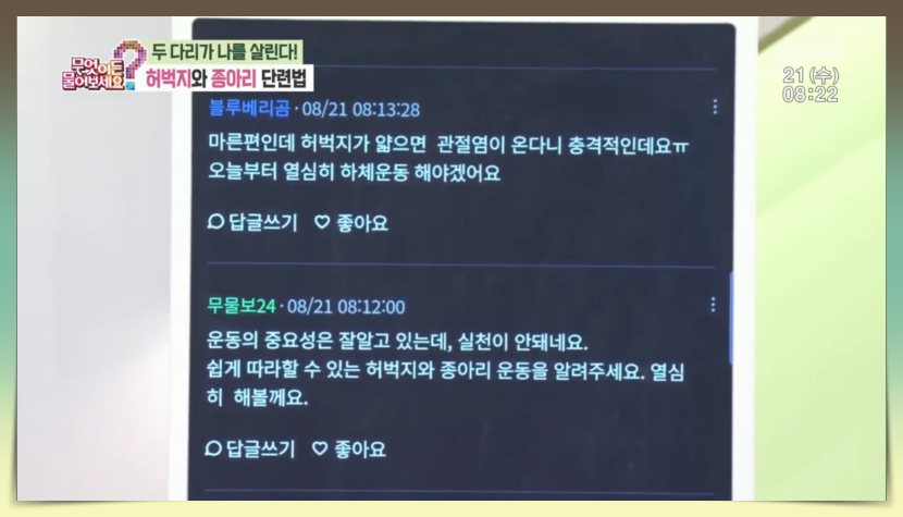제가 시청한 날의 주제는 허벅지와 종아리 단련법에 대한 것이었습니다.